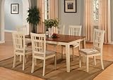 | ✚✚✚ East West Furniture N7-WHI-C Nicoli 7PC Set with Rectangular Dining Table featured 12 in. Butterfly Leaf and 6 Upholstered seat chairs. Rectangular dining table offers a touch of luxury and traditional styling with a modern flair. Dinette sets are manufactured of pure Asian solid wood for durability and superb stability. Table and chairs are available in a polished black & saddle brown color, as well as a crisp buttermilk & saddle brown option. Sturdy hairs are designed with a simple geometric back that adds an element of class to any dining room. Table features an easy-to-use butterfly leaf with additional storage for superior convenience. Chairs are available with plush upholstered seat or with solid wooden seat to cater to any preference. Color: Buttermilk & Saddle Brown